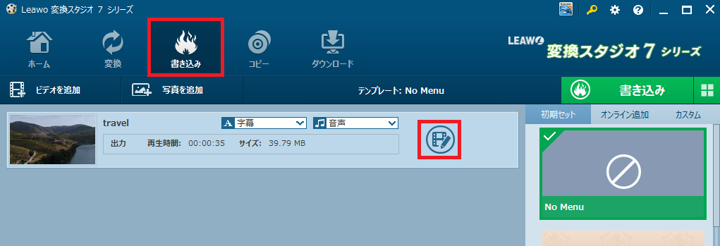 本製品では、動画編集機能は「書き込み」タブ内で行います。