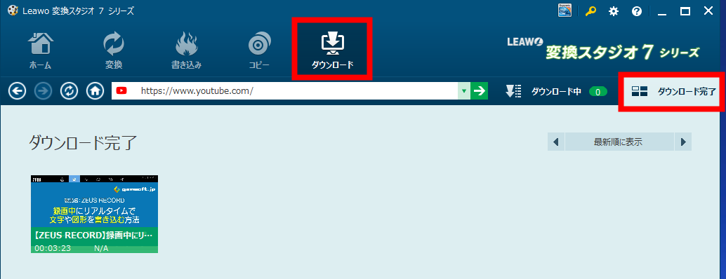 「ダウンロードタブ」内の「ダウンロード完了」ボタンをクリックします。