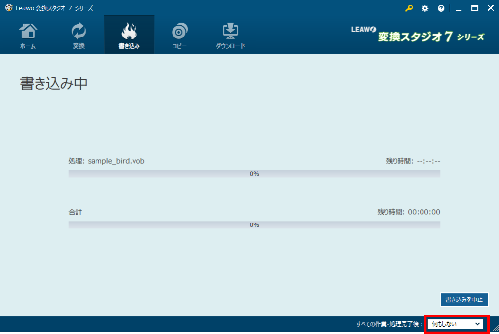 変換スタジオ7の書き込み機能には終了後の動作を指示することができます。