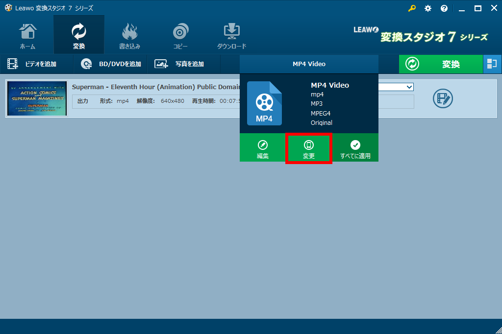 「MP4 Video」をクリックして、下へ出てくる画面の「変更」ボタンをクリックします。