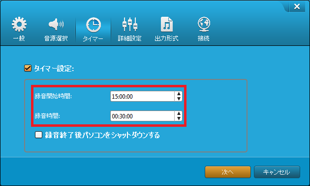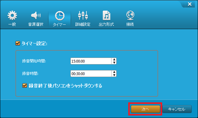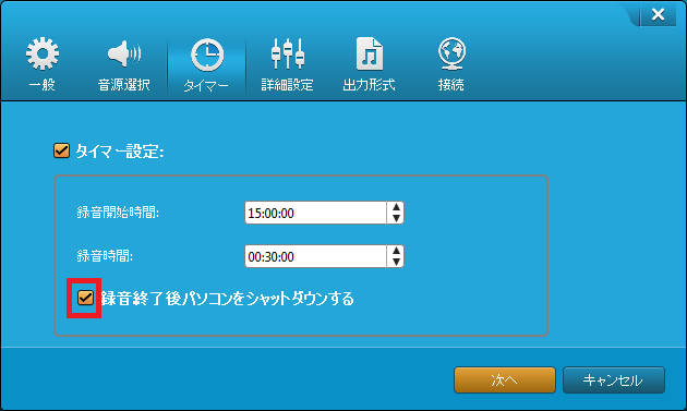 ※「録音終了後パソコンをシャットダウンする」にチェックを入れると録音終了後に
