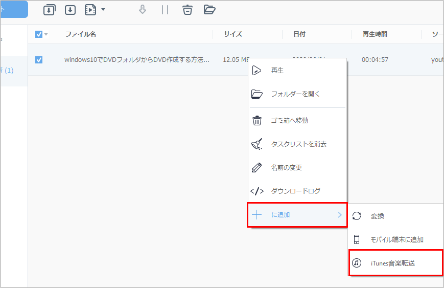 iTunesに転送したい動画を右クリックし、「+に追加」の中から「iTunes音楽転送」をクリックします。