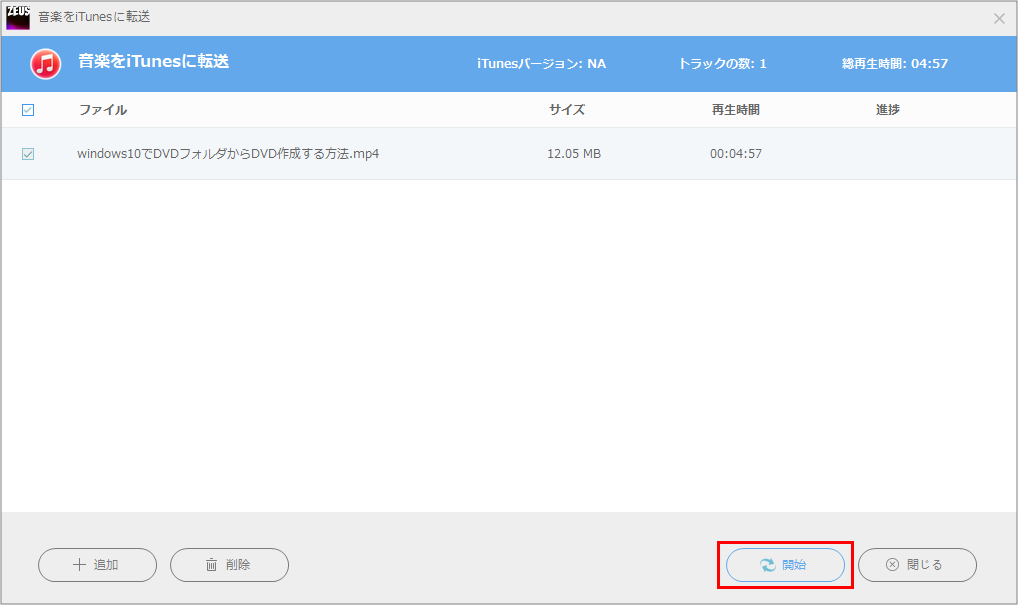 「開始」をクリックすると動画ファイルのiTunesへの転送が始まります。
