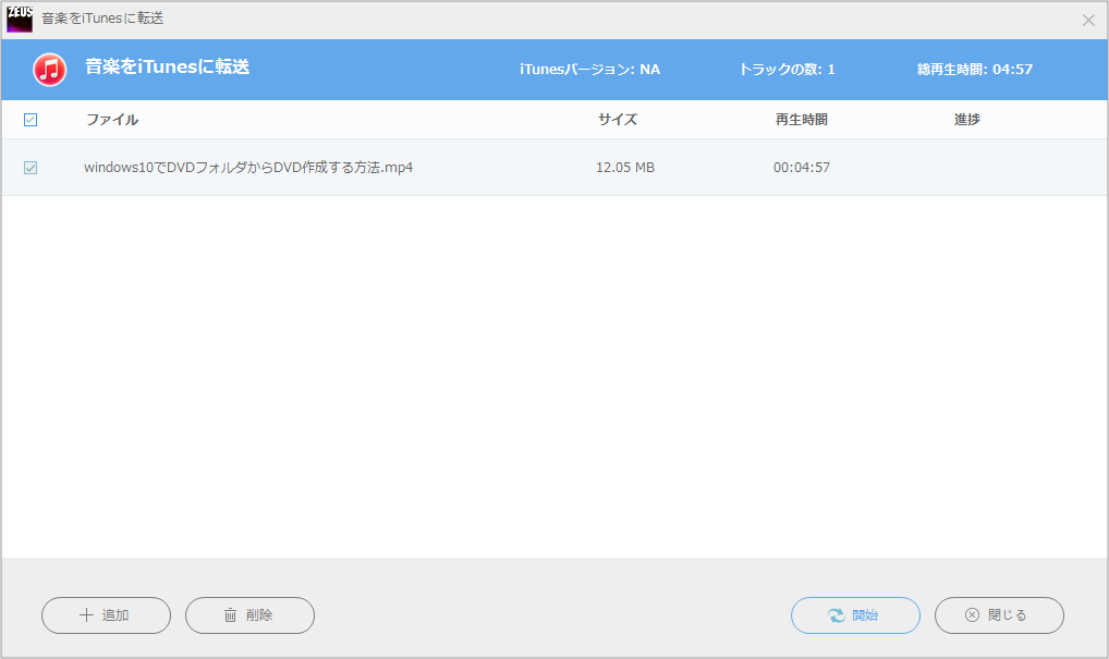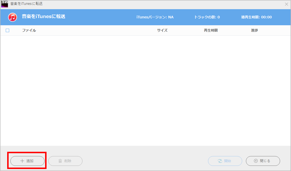 「追加」をクリックしてiTunesに転送したい動画ファイルを追加します。