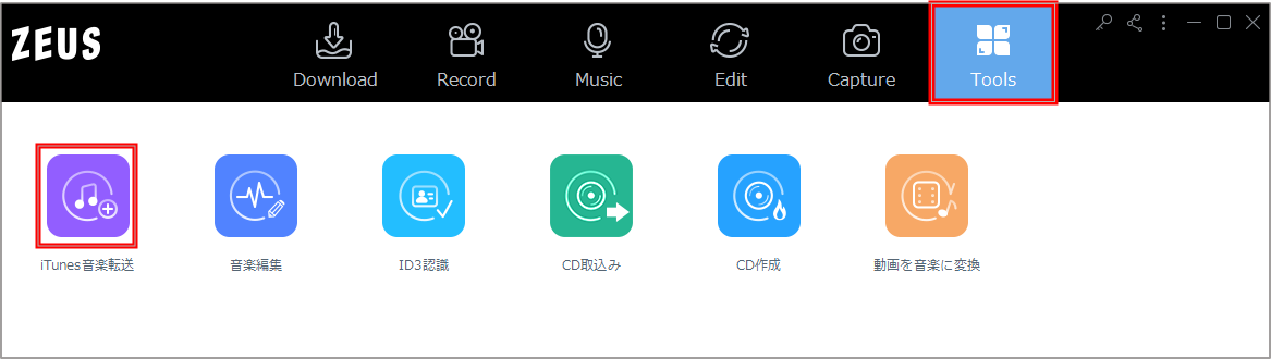 「Tools」内の「iTunes音楽転送」をクリックします。