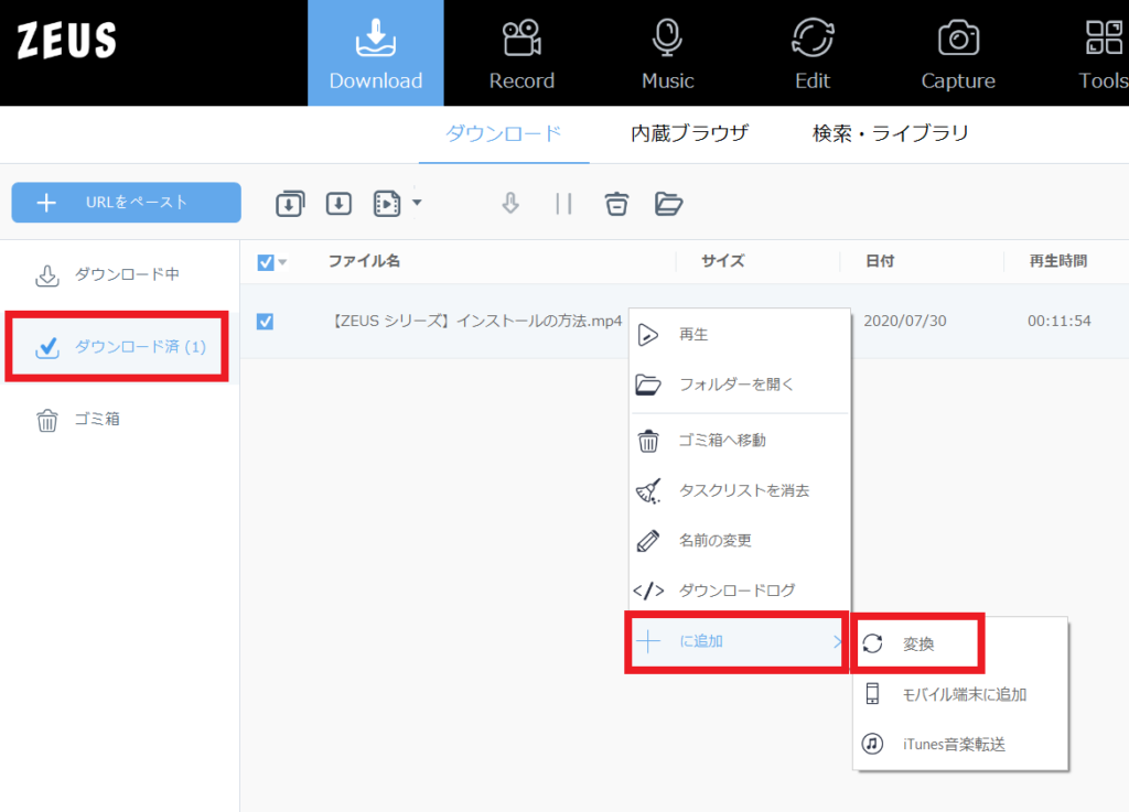 「ダウンロード済」タブ内からEdit機能に追加したい動画ファイルを右クリックして