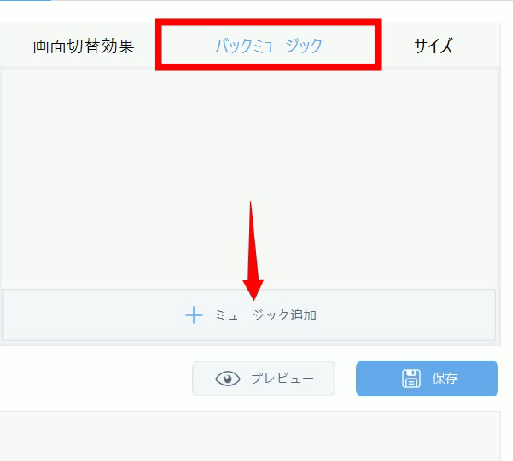 「バックミュージック」タブをクリックし「ミュージック追加」から音楽ファイルを選択します。