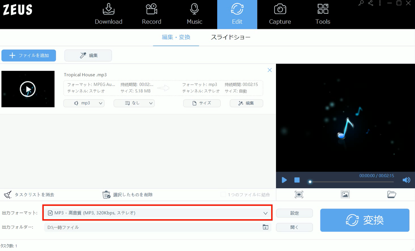 ☆ ZEUS EDIT でMP3などの音楽ファイルを動画ファイルに変換する方法