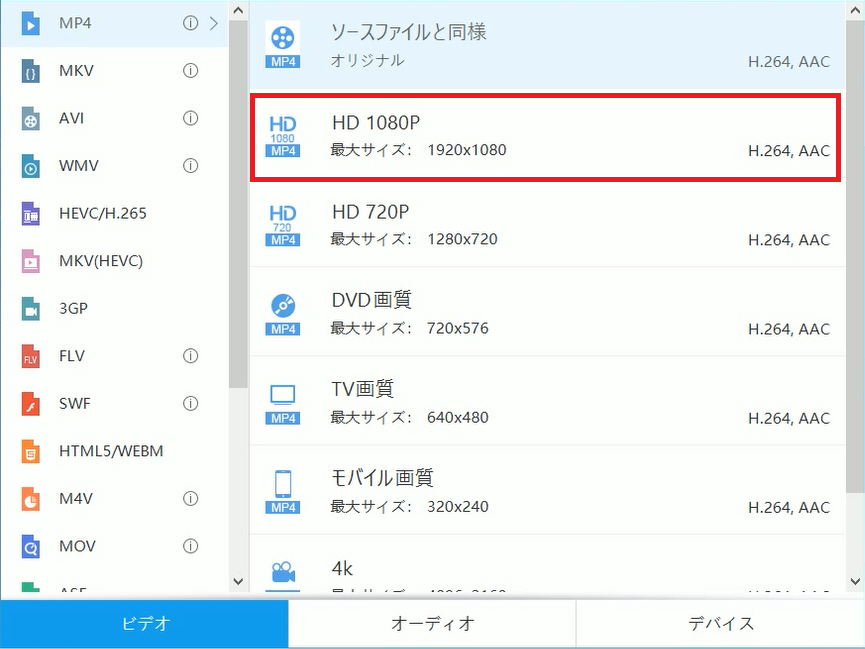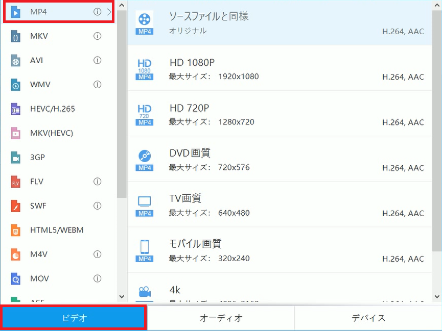プロファイル選択画面の「ビデオ」の中から「MP4」を選択します。